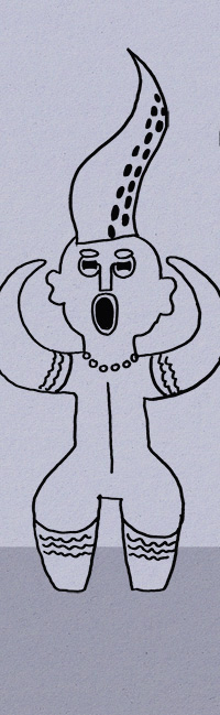 | ■私は友人と共にこれまた国宝のタコ式土器とタコ舟を見ながら「世にも変な土器だなー、そう言えば・・・」とわいわいと雑談を楽しんでいたならば、急にタコ舟のタコ旗がはためき土器に「シー」と注意される。当博物館での大きな声の私語やお食事しながらのご鑑賞はお控え下さいタコ。 |