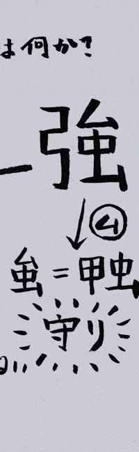 | ■一日一文章トレーニング。 「あなたの強みとは何ですか?」 と聞かれてスラスラと答えることの出来る人とは良く出来たお人なのか?または、マニュアルな型を持つペテン師かもしれない。 私の強みとは何かと考えれば大問題ですが、自分の「強み」とは何かと考えれば、それは自分自身を見つめるような作業でもある。 私の頭に最初に浮かんだのが「ゲームを少々嗜んでおります」なゲームで遊ぶこと。 強みを得意と解釈しているもので困ったことだ。 もし仮に「私も何々のゲームをやっていましたよ」などとトントンと話も弾むとすれば、ダクソ系などを少々嗜んでいるぐらいのゲーム好きでなので、ほとんどのゲームは遊んだこともない。 よって、「そのゲームもそのゲームもとやったことなく、アハハ」と何だ?コイツみたいになる!! ダクソ系のゲームとは他人のゲームの世界に侵入したり、自分のゲームの世界に他者が侵入したりと予想外のゲーム展開を生み出すことが好きなもので、「そのような場所から攻撃して来るのかー」との予想外のクリエイティビティな攻撃に私は感動している。 なので、一般的なゲームの楽しみ方と少々異なるような気もして、ゲームで遊ぶことを自分の強みにしてしまう脳みそは少々痛い。 そのようなゲームの強みは何に活かせるかと考えれば、斜め上のドローン攻撃ぐらいはできそうでクリエイティブな攻撃ならダクソの侵入勢は専門家でもある。 ならば、「絵を少々嗜んでおります」でも良いかな。 毎日、絵を描くことも毎回何を描こうかと頭を悩ませるもので、長文を書くぐらいに集中力は高めている。 しかし、「どのような絵を描かれていますか」と聞かれてタコ埴輪のような絵を見せれば「ふ~ん」みたいな間違いなく気まずい空気が流れる。 「何々風の画風ですか」と言われても何々風の画風もないもので、タコ埴輪の絵を見せる方も、見せられる人も気まずい。 そして、国宝タコ埴輪について真面目に「そのような埴輪はありません」と言われたとしても、「いやはやその通りでございます」がと、創作とはタコ埴輪のようなものかなと思うものだ。 ならば、「文章を多少嗜んでおります」と書くことは強みになるかと考えるものでワード5ページぐらいならスラスラと書けるようにトレーニングしている。 なので、得意と言えば得意かもしれないし強みかもしれない。 しかし、上手下手で言えば無茶苦茶な文章でもあり下手である。 文書とは書けば書くほど下手になるもので、長文を読む苦痛を多少和らげるようにシンプルに面白可笑しく脚色する強みはあるものの、絵も文章も「味」だと思っている。 文章とはイタコさんではない限り考えている以上のことは書けないもので、たくさんも書けば頭の図書館もそれなり整理されるものだ。 そして、文章を書きながら「あれはこーかな、これはこうじゃないから、やっぱりこうかな」と試行錯誤をする人間の芯を作るような部分はある。 絵が「みる力を鍛えること」だとすると、文章は「感じる力を磨くこと」である。 おそらく、文章には「論理的に積み上げる文章」と「感じる文章」二種類あって、私の場合は後者の方が大きいのですが論理的に人の強みとは何かと知ろうとすると下記のように書く。 「強み」とは弓と虫の字で出来ており、虫の字にムの字が付くことで硬い甲羅を持つカブトムシやカナブンのような甲虫の意。 飛び道具である攻撃用の弓と、硬い甲羅のある甲冑を合わせ持つことで「強い」となり、攻守の2つの要素が交わったものを「強み」と表現するようである。 この漢字の意味から解釈すると、人の持つ「強み」とは秀でたものと同様に、守りの強み部分についても書かないといけないように思うものだ。 本当の「強み」を知ろうと思えば「弱み」について知る必要もある。 ここで面白いことは弱みの武器は攻撃用の弓が2本揃っているのに「弱い」意味となること。 私の解釈では弓の下のンは「羽」の字のンと同じで、たくさんの攻撃用の弓と矢が並んでいるように見える。 なのに弱い。 そう言えば、「強い」弓には矢のンは書かれていないもので、「ペンは剣より強し」のような備える強さを表現しているのかもしれませんし、本当の強さについて表現されているようにも思うものだ。 これは防衛力の欠如なのか、歩兵の装備がないことを意味するのか、わかりませんが攻撃的な兵器だけでは弱くなってしまうのが強弱な漢字の概念を生み出した人の心の深さの一面である。 これが私が思った「強い・弱い」の面白いところ。 強み:「弓+ム虫」矢のない攻撃用弓と甲冑 弱み:「弓にン+弓にン」攻撃用弓と矢がたくさんある状態 幸いに、私にはもう自分の「強みや弱み」について考えるようなお年頃でもないもので、振り返っても自分の強みなどを聞かれた記憶もない。 そもそも弱いことはダメで強いことが良いことなのかの疑問もあるもので、弱いからこそたくさんの武器を持つこと