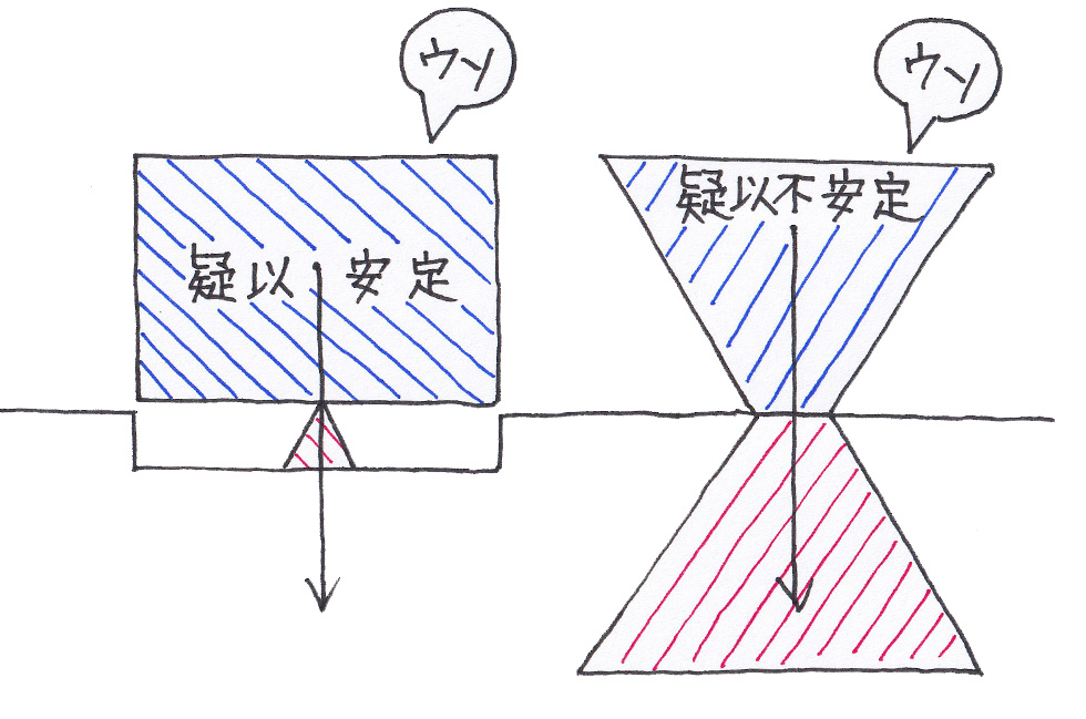 | ■一日一文章トレーニング。 「疑似不安定?」 今日の天気は不安定・安定?価格が安定・不安定している?などなど「安定や不安定」な視点は二元論的な見方です。そして、具体的な「安定や不安定」なカタチを探していたならば、全く異なる“もの”と思われる「やわらかい布(第三極)」を見つけます。「やわらかい布」はいつでもまとわりつくように地面に対して安定をしており、且つ、いつでも不安定なカタチで落ち着きません。そして、昨日はグラつく側溝のフタから「疑似安定(第四極)と疑似不安定(第五極)」という新しいカタチの概念も拾いました。これらは「疑似」という言葉が付く通りに見せかけの外観です。(見た目) 「疑似安定」とは安定しているように見えますが実際はグラグラと安定しない不安定な状態を意味します。昨日の側溝のパネルのように支点で支えられて踏んづけることで初めてグラつきを感じます。言わば知らない人にとっては不意打ちやトラップの類。それらの内情を知る者にとってはハリボテの見せかけで虚飾された飾り付けです。不安定だけれども一様に支点で支えられて安定している状態。 「疑似不安定」とは不安定なカタチに見えますが力学的な安定を保つカタチとなります。不安定そうに見えるのは見せかけです。倒れそうで倒れないもの。鳥や人のカタチは一見「不安定」のように見えますが様々な運動をこなして行動的。なので、もしかしたら鳥や人のカタチは「不安定」というよりも「疑似不安定」のようにも見えてきます。概念的な鉛直線上を意識すれば「疑似不安定」的なカタチです。一方で年老いると体が融通効かなくなり歩くことも大変になることを考えれば「疑似不安定」というよりも「不安定」の方が正しい感じもします。しかし、それは老人になると背中も曲がり体のカタチも変化することで重心なバランスも大きく移動します。故に老化とは「疑似不安定」の「安定」が崩れた形とも言える訳で鳥や人のカタチとはやっぱり「疑似不安定」であるような気もします。勿論、単に筋力も落ちて歩きにくくなるだけかもしれません。これは老人になって体験するまでわからないことです。鳥や人のカタチとは「不安定」か「疑似不安定」のどちらのカタチなのでしょうか。 疑問?疑問?が続きますが「疑似不安定」の先にも進化の道はあるのでしょうか?「不安定の先に進化の道がある」とすれば内戦や政府がコロコロと変わるような政情不安定な国でも次なる発展性が高いと言えるはずです。しかし、荒廃した国土を前にして「はい」とはなかなか言いにくいものであります。ですが、長期的な視点に立てばひどい内戦を経て安定した統一国家や政権が作られることも十分にあり得ることです。一方で「疑似不安定」とは不安定に見えるけれども実情はすごく「安定」しております。「安定」していることは「安定」の上に胡坐をかき進化の道は閉ざされている意味にはなりますが、外見上は疑似的にも「不安定」なので、これを嘘の一つと考えれば「不安定の先に進化の道がある」と言う考えも同居している状態とも言えます。このようなカタチは問題山積な事柄が表に現れ出る西側先進国的なカタチなのかもしれません。 |