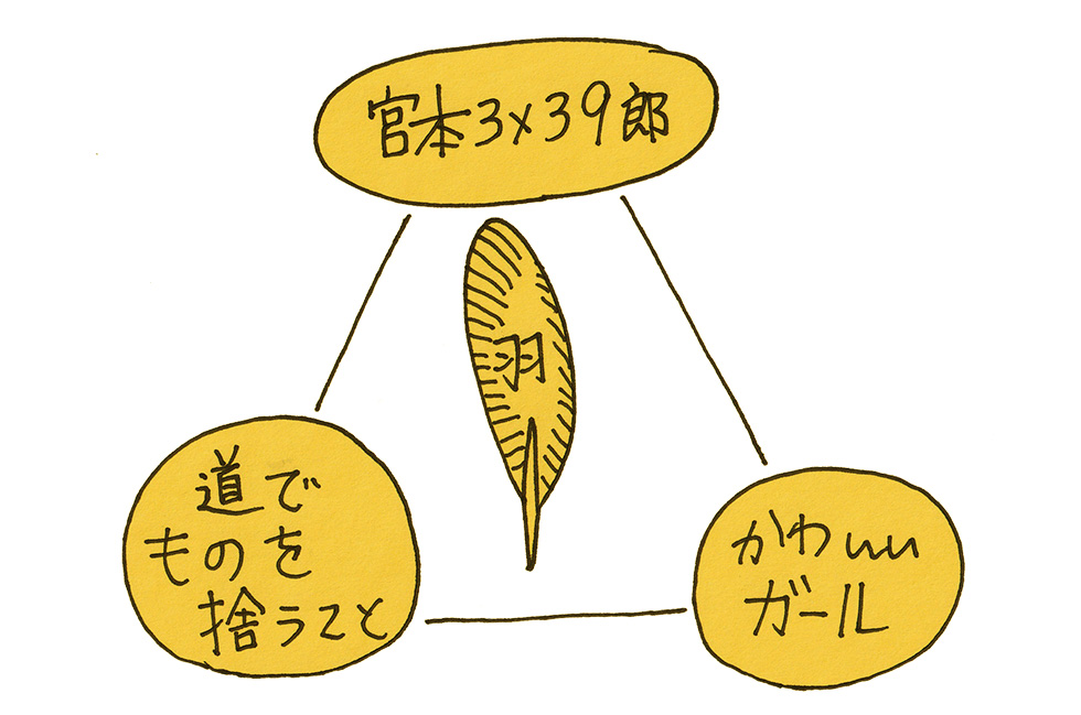 | ■一日一文章トレーニング。 「小料理屋の門」 (※何をやっているの?と思いますが羅生門的な、先日考えた思いつきを物語にしてみました。架空の人物、空想の物語、上図は文章の構造、何かいろんなことをしながら書くのに3時間かかりました!!) 宮本三三九郎の話。誰の話?という話です。それは小生のことである。剣術宮本武蔵の名字に掛け算ぽい名前を持つごく普通の一般人。趣味はゲームとグルメ、武道は全然ダメでカフェの人間観察も好き。カフェ好きと言えば人間観察が好き。人間観察が好きと言えばカフェに座っている人達ももしかして皆人間観察が好きかも。カフェで人間観察するようになってから、もしかしたら自分自身もカフェ内の誰かによって観察対象になっているのかもしれないと考えるようになり最近はカフェからも遠ざかる毎日。所謂、考えすぎの小心者、そして、時に大胆でもありごく普通なサラリーマン。自転車も好きで、最近はもっと体も鍛えないといけないとランニングすることも考えている。走る気持ちになったらいつでも走れるようにラン用の服は購入して用意している。準備が良い実家暮らし29歳独身宮本三三九郎。もし、自分のプロフィールに趣味の欄があれば読む気も失せる程にプロフィール欄がギッシリと埋まってしまうかもしれない。簡潔に書けない趣味とは無趣味と同義かもしれない。趣味の欄が「無趣味」と大きな三文字で書かれていると、それはそれで何か、かかわりたくない人物三要素の一つを持ち得るような気もします。それならば、いっそギッシリと書き込む趣味の欄。そもそも、趣味の欄って何のことだろう?怪しげなサイトに登録するプロフィールみたいなものかもしれない。誰も宮本三三九郎に興味はなく、勿論、家族でさえ決して読まないだろうそのプロフィールがネット上に流出したとしてもネット上の一瞬キラリと光るだけの流れ星のような無価値なもののはず。それでも、流星の瞬きには願いを叶える瞬間はあるかもしれない。小生は最近、鳥の羽根に興味がある。冬場に偶然拾った鳥の羽根と今の夏場に拾った羽根の雰囲気は微妙に異なっているのに気づいてそれがとても気になっている。その違いは夏場に拾った羽根が透過して透けて見えるのに比べて冬の羽根は全く透過しないこと。これは夏の羽根だけが持つ特性なのか?鳥の固体の持つ特性なのか?透過する羽根と透過しない羽根の違いのナゾが気になる。そこで、この夏シーズンに数枚の鳥の夏羽根を拾って比較したいと考えている。趣味の欄に「鳥の羽根を拾うこと」のプロフィールも少しやばめな趣味なのかもしれない。鳥の羽根とは人間で言うところの爪と同じもの。「鳥の羽根の収集」は見る人から見れば「爪を収集」していることと同じように見えるかもしれない。 羽根をゲットするということは飛んでいる鳥を捕まえて羽をむしりとるような野蛮なアベンジャーズな能力が必要です。そのような能力者ではないのでひたすら地面を眺めて歩きます。道端で羽根を拾うことは偶然の出来事。偶然ではありますが案外落ちているのも羽根です。顔をまっすぐ正面を見て歩くことは真っ当な人の行動ですが、羽根探し人は地面に何か落ちていないのか下向きながら歩きます。それは散歩中の犬が「くんくん」と匂いを嗅ぎながら歩いていることに似ています。そして、もし、道端に羽根が落ちていてもそれを拾うことは、小生の道徳観をひどく傷つける葛藤する行動でもあります。小生が羽根をゲットすべく狙い目の道はなかなかの人通りある道路。坂を下る人は地下鉄の駅に向かう並木道を下り、坂を上る人たちも勤務場所や地下鉄の駅に向かって歩きます。いうなれば、いつでも人が歩いている道で羽根なり何なりを拾うとすると必ず誰かの目に触れる道でもあります。毎日通る道で羽根収集の趣味を実行できる場所はここだけとなります。先日、朝坂道を普段通りに下っていたら歩道にキレイな茶色の羽根を見つけました。何たたる僥倖、幸せラッキーということで、その羽根を拾う為に向かっていたら前方からキレイなお姉さんが坂を上ってきます。小生は一瞬考えました。このお姉さまの前で道端の羽根を拾ったら何と思われるであろうか?拾う?やはり紳士なメンツも保ちたい、拾わない?いやいやキレイな茶色い羽根を拾うチャンスでもあります。拾わない選択肢なんてあり得ない。などと考えていると落ちている羽根を通り過ぎて、きれいなお姉さまともすれ違い坂道を下っていました。見知らぬ女に見栄を張り結局、羽根もゲットできずに帰り道に再トライしますが、当然、羽根はなく、小生は決断を誤りました。羽根との出会いは一期一会。今、拾わないと明日にはないかもしれません。以前、墓場で羽根を見つけ時には数日後にも残ることもあります。それは墓場の特性で歩道の羽根は風に飛ばされ、掃除で回収され、もしくは子供の玩具になるかもしれません。いつどこで落