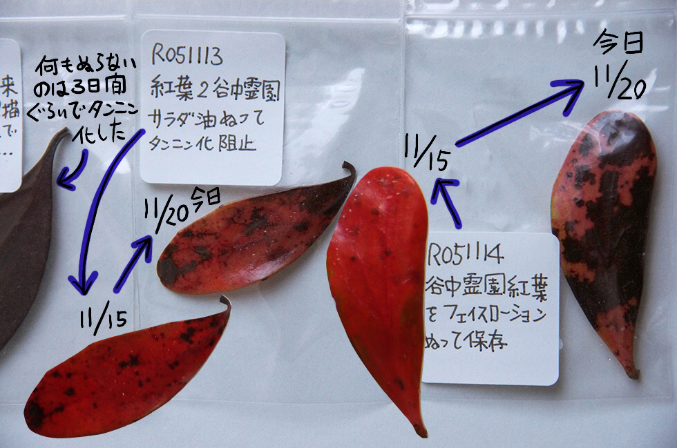 | ■一日一文章トレーニング。 「紅葉の赤はキレイですが、真っ黒茶に変色した葉っぱも美しい色をしていることに気付いた」 世界広しと言えども、茶色くくすんだ色に美を見出す国民はなかなかいないと思う。 茶色く長い月日を感じるお寺、茶色く錆びた看板、使い込まれて古びた木目、どれも美しき侘び寂びである。 秋が和歌の歌い人にとって悲しき季節であったように、紅葉真っ盛りの木々が次々と赤くなってサビていく今の景色もなかなかに物悲しく見えるものかもしれない。 なので、今こそが侘び寂び週間でもある。 写真は紅葉した落ち葉を拾ってきて、キレイな赤色を保存する為の実験である。 11月13日に拾った紅葉はサラダ油を塗り、その次の日の11月14日に拾った紅葉には人が使うフェイスローションで塗り、タンニン化がどのように進行するのか?止めることはできるのか?を調べたものである。 結果はサラダ油に浸した方がタンニン化の進行を防ぐ効果はある。 そして、どちらも最初の赤い美しい紅葉色を失っている。 11月6日に拾った紅葉は3日間で真っ黒に変色したので、油でコーティングしたものには何かしらの色の変化を遅らせる効果があることはわかります。 だから、何なのだと言っても何でもない実験でもある。 一週間前に仕込んだネタを今朝収穫するような感じなので、勿論ノープラン。 色の変化が化学物質の化学変化だとすると、ベンゼン環が繋がる分子の構造が壊れて色が変化していくことだと思えば、何となく思慮深く眺めることのできる色変化でもある。 本当はベンゼンなどを持っていればHとOも加えて、分子が壊れないようにその中にホルマリン漬けしたくも思うのですが、普通の家庭にはベンゼンもないし、そのような気持ち悪い容器を作ると捨てるにも一苦労となるので身の回りにあるものだけで十分だ。 赤くキレイだった葉っぱは一晩でその鮮やかな色は失われて、黒くまだらなシミがどんどんと広がります。 そのような美しさを破壊していく様子は、私を恐怖させるのに十分である。 ですが、そのような色変化で劣化していく様子も観察していると、なかなかに美しき色合いを発見することもできる。 まだら模様は赤と茶黒のせめぎ合うイモリなどの水性両生類みたいな感じで美しい。 ローション漬けの葉っぱが”面”で茶色く変色しているのに比べて、サラダ油漬けの方は”子葉の線”に沿って黒く変色してきていることも面白い。 恐らく、乾燥した葉っぱの表面に油が浸透しているので、葉っぱ内部構造に沿って劣化が進行しているだと思います。 その意味ではローション油は表面だけをコーティングする感じで浸透はしないのかもしれない。 そして、今や真っ黒というか茶褐色になった紅葉の落ち葉もよく見ると美しい色であることに気付く。 その黒は戦国時代の武人の鎧みたいな落ち着いた色で、炭化したようなその黒茶は日本の伝統色で間違いない。 最初はパソコン上でも写真でも保存が効かない美しい紅葉の赤を保存することが目標でしたが、この焦げ茶を見るとこの黒色こそが哲学的な深みがあって最も美しい色ではないのかと思ったりもする。 紅葉の赤も美しいのですが、枯れ果てた黒にも美を見出だすことができたことは、少しは利休の美の神秘に近づけたかもと思う今日この頃である。 |
