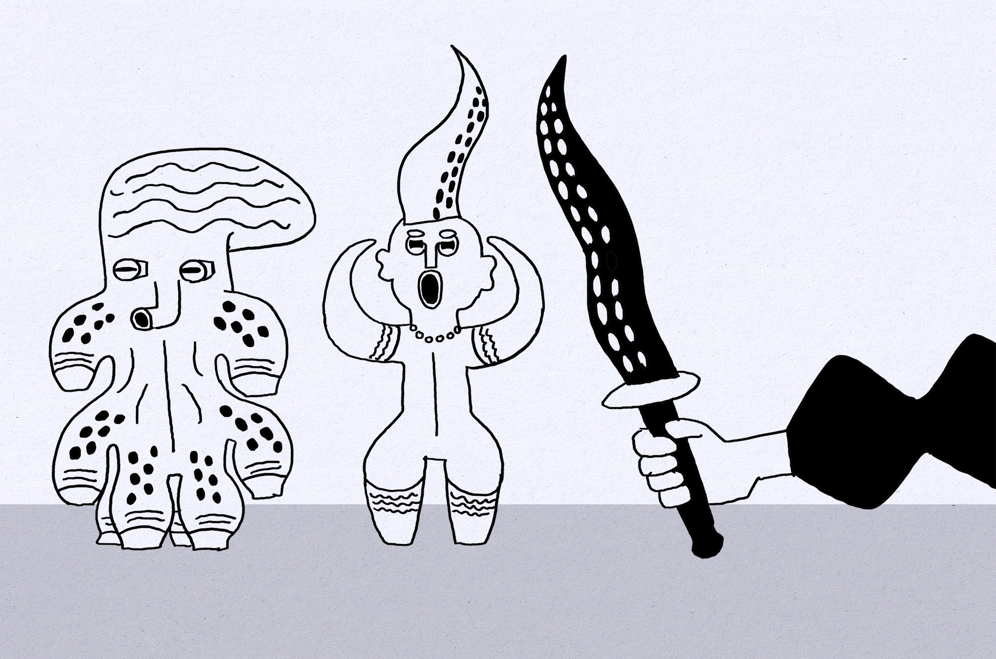 | ■私はある時国立博物館に行き古墳から出土した国宝のタコ埴輪を鑑賞していたならば、我が家秘刀のタコナイフと埴輪の毛(タコ足?)が反応しはじめた。赤紫と夕焼け空がキレイに輝くそんな日の出来事であった。Byラヴラヴ工作 |