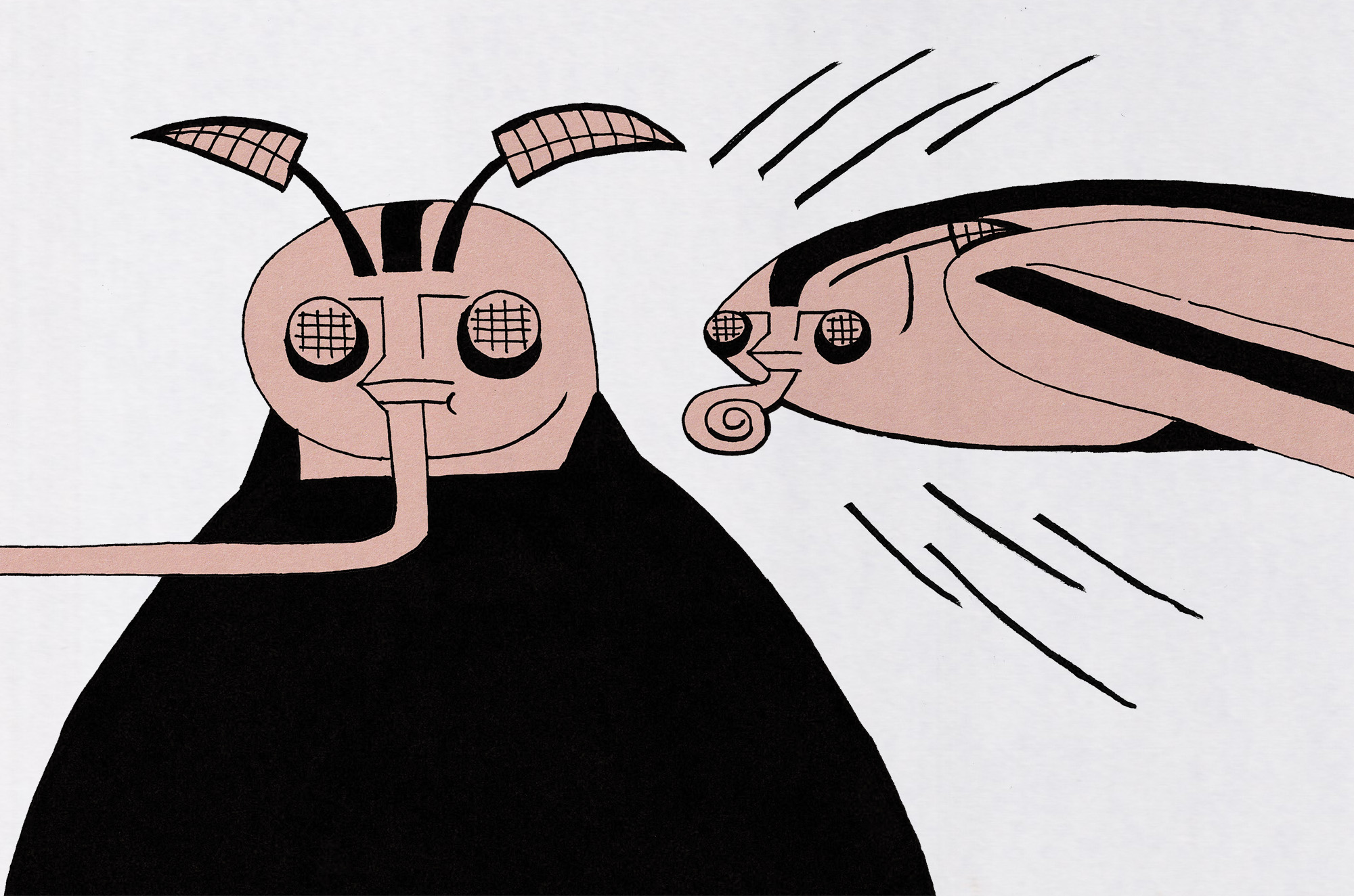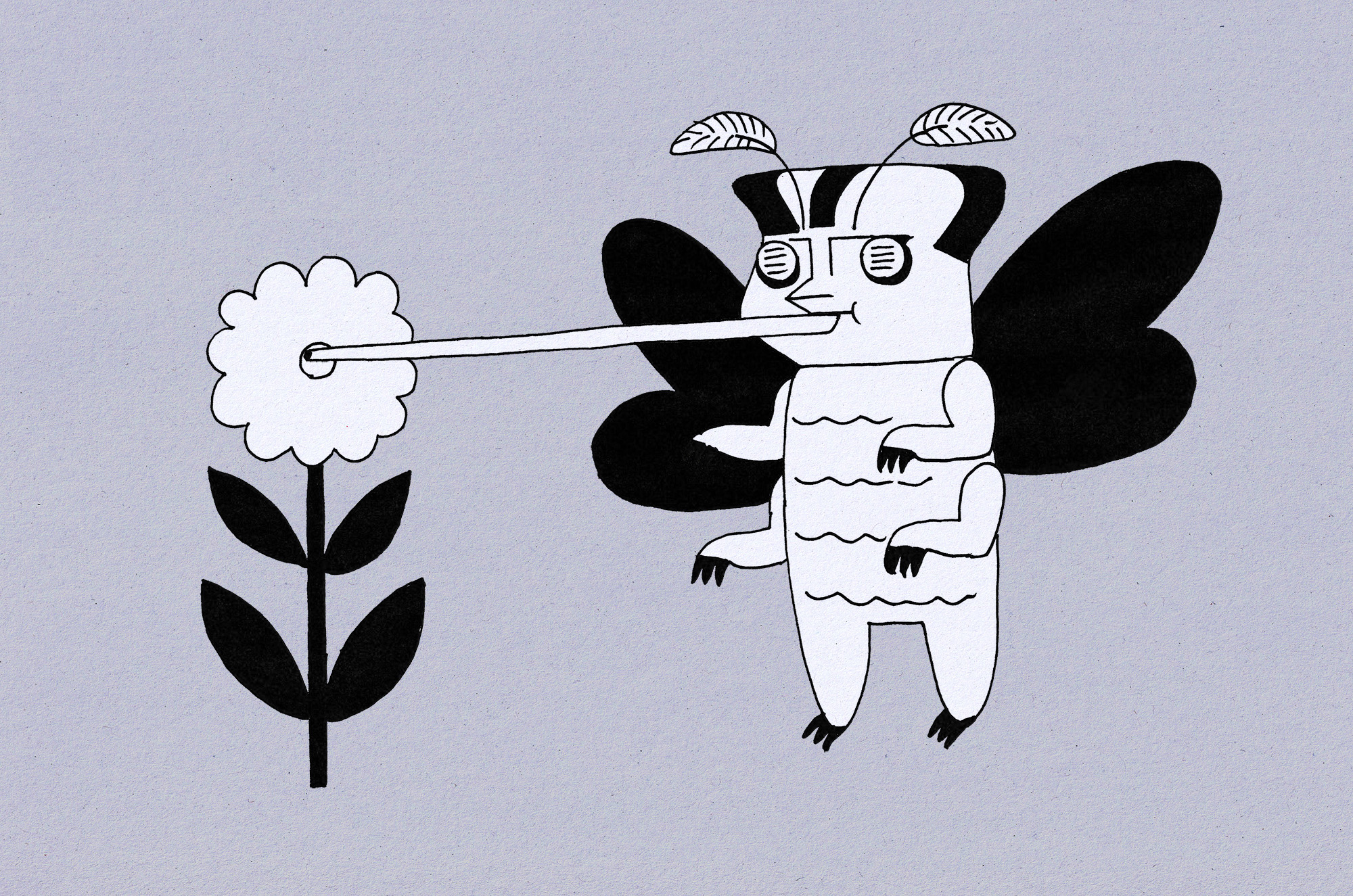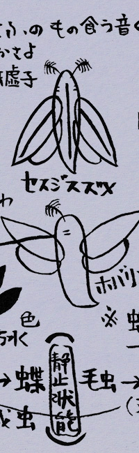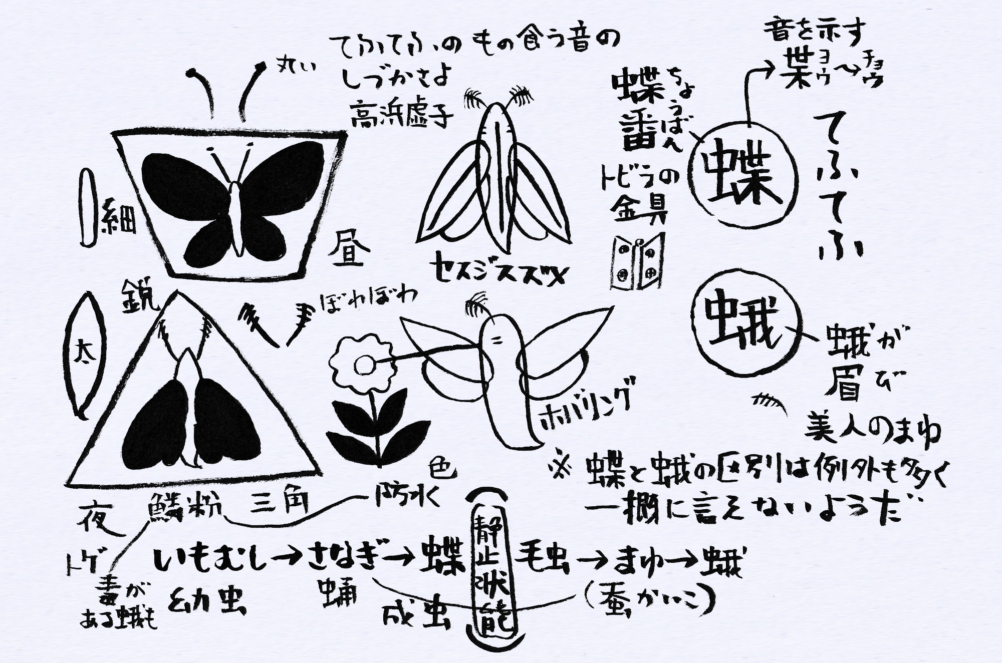 | ■一日一文章トレーニング。 「蝶々(てふてふ)のもの食う音の静けさよ by高浜虚子」 蝶々と言えば、やっぱり「てふてふ」である。 学校で「てふてふ」な言葉を学んだ瞬間からオレたちの蝶々と言えば「てふてふ」のコトである。 蝶と蛾の違いについて調べていたならば、蝶の字の(世+木)でひらひらと飛ぶ音を示しているようで、蝶とは音の概念を持つものだ。 そして、蛾とは我のことのようでもありますがギザギザの刃のある戈のことのことのようでもある。 蝶の飛行から何かの楽器を連想するかと思えば、私ならば「キンキン・コロロコ」と鉄琴や木琴のリズミカルな音色。 ジグザグとひらひらと時に風に流されながら花から花へと飛ぶ姿は管楽器のポンポンと弾むイメージで、花に止まって蜜を吸う時に音は完全に消えて草原の静かなる静寂を作り出す。 高浜虚子はこのような「てふてふ」と音を奏でる蝶が花に止まり蜜を吸う姿に静けさを見出したもので、この俳句は賑やかな蝶の舞の後の静かな一瞬を切り取っているようにも思うものだ。 高浜虚子のことは何も知らないけれども、縁側に座って花壇の花々と「てふてふ」を眺める虚子の姿。 松尾芭蕉の「閑さや岩にしみ入る蝉の声」にしても俳句から音が脳内に響くことは多々あるもので、文章を読みながら「シーン」とした静けさや何かしらの音を感じれることはとても素敵なことだ。 そして、蝶と蛾の違いをいろいろと調べていたならば図のようになる。 俳句っぽく墨と筆で書けばそれなり味わいも出るもので、それは私の求める味そのもの。 昼間に優雅に活動するのが蝶であり、夜に活動するのが蛾である。 蝶は胴体が細長で、蛾は胴体がどっぷりと大きいのが特徴で、活動量も蛾の方がアクティブな気もする。 実際に外灯などをブンブンと飛ぶ回る蛾の羽根の羽ばたきとは蝶よりも速いスピードで、昨日のセスジスズメの蜜を吸うホバリングな羽ばたきも高速である。 しかし、遠方まで飛行する蝶もいるようで、蝶と蛾の違いとは生活スタイルの違いかもしれない。 蝶の触覚は先端が丸く、蛾はふさふさの立派で少し不気味な触覚を持つ。 蛾の言葉としては蛾眉(がび)という言葉もあって、これは蛾のようなふさふさとキレイに曲がった眉のことで、美人や美人の眉のことを蛾眉と言う。 夜に飛翔する蛾の触覚のセンサーも複雑な機能性がカタチとなり、そして、図のように蛾の先端は尖った三角形で蝶は逆三角形型となる。 止まった時の蝶は蝶番のように羽根を閉じて止まり、蛾は平たく三角形に止まる。 蝶がイモムシからサナギ・蛹になり蝶となれば、蛾は毛虫から蚕な“まゆ”を作って蛾となるもので、このような幼虫→サナギ・まゆ(静止状態)→成虫となる構造が面白い。 人にはこのような静止期間はないもので連続して成長するものだ。 変化を受容することとは大きなエネルギーを蓄える静止期間も必要なのかもしれない。 しかし、蝶と蛾には上記な例外も多いらしくて一概に単純に蛾と蝶を分別できないようだ。 子供の頃に捕獲したことのある蝶や蛾はアゲハチョウ・モンシロチョウ・シジミチョウ・クロアゲハと謎の蛾ぐらいである。 蛾は捕まえると手に粉がイッパイついて気持ち悪かった思い出で、それ以来触れないようにしている。 この手に付く粉は鱗粉と言うようで中には毒やトゲがあるものも生息しているようで掴んだ時の違和感とはそのような不快感な怖さかもしれない。 鱗粉には防水機能や色素の元があるようで、鱗粉をキレイに落とすと羽根は透明になるようだ。 鱗粉のことを考えていたならば、子供が目の前のものを何でも触ったり口に入れたりするもので、すぐに病気や体調を崩すのもわかるものだ。 そして、蝶々も鱗粉が付きますが、こちらの粉はあまり気にならない。 そして、「てふてふ」と飛ぶ大きなクロアゲハを追いかけて神社の暗い竹林の暗闇に足を踏み入れたならば何だか怖くなった記憶もあるもので、今まで捕まえた蝶や蛾の内の2/5は怖かったものである。 道理で元イモムシや元毛虫であるだけの、私にとって蝶や蛾とは結構怖い昆虫なのかもしれない。 |