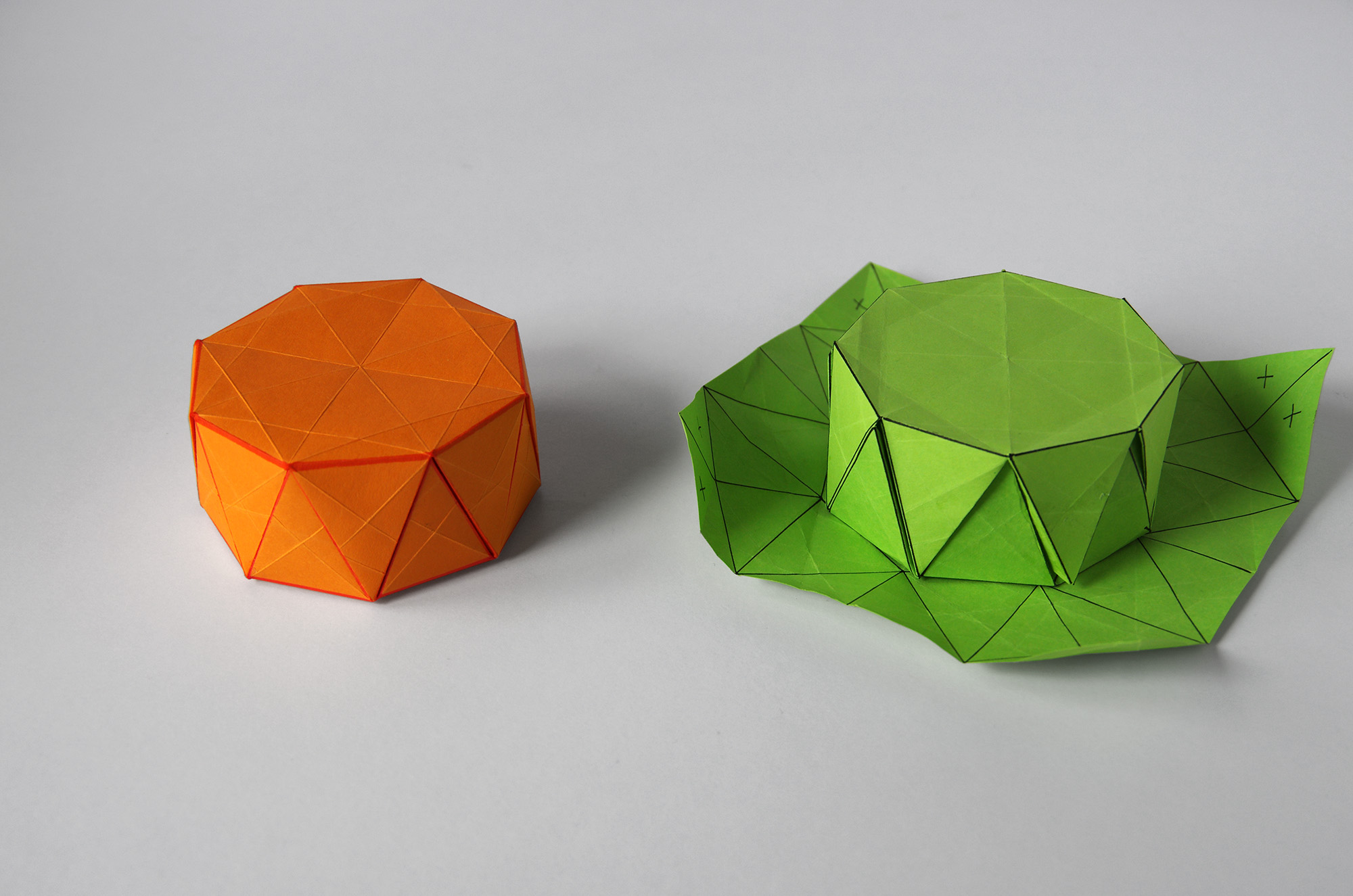 | ■一日一文章トレーニング。 「橙の折り紙を完成させたよ」 R080217 聖護院大根の花は1花散って14輪咲く。 R080217 柑橘系植物の葉は5センチ伸びて6葉生える。 R080218 聖護院大根の花は3花散って12輪咲く。 R080218 柑橘系植物の葉は5.5センチ伸び2葉生えて8葉となる。 植物の日々の成長は止まらないもので生命や成長とは本当に凄い。 そして、 私は昨晩お風呂上がりに先日作った失敗作の橙に再チャレンジする。 失敗作とは放置することなく再トライすることに意味があるもので、このような製作途中のものは完結させたい。 これを一般的には執念や執着と言うのだろう。 私は夜な夜な失敗作を完成させようと切り貼りしているもので、確かに執念はあるのかも。 この「執」となる字は刑罰の道具と罪人を捕える形の会意のようで、「幸」+「丸」の字で執筆や執行と執り行うことの正当性を表す。 または、執念や執着のように深く思い込みにとらわれて熱中することも、丸く転がるような幸せと表現している。 昨今、執念・執着とは暑苦しくて否定されがちな概念だ。 しかし、何か得ようと思うと必ず多少の執念や執着は必要なもので、逆に執念や執着の無い道の先の完成品とは“こだわり”や心意気、心の内の何かが欠落しているような気もする。 これは工業製品のような製作物でなくとも、食べ物でも何でも作り手の「執」なる何かと感じる。 ・執着とは物事に強く心が惹かれて深く思い込むこと。 ・執念とはかたく思い込み動じない心のことで、しつこい心のこと。 執着・執念することとは上記のように必ずしもマイナスな意味を持つものではない。 ※多少のしつこさの戒めはあるように思う。 なぜ?執着や執念にマイナスなイメージを発生するかと考えれば、それは偏執(へんしゅう)、確執(かくしつ)、固執(こしつ・こしゅう)等の「執」なる言葉にあるのかもしれない。 「執」なる文字の規則性とにらめっこすると、私はとある呆則を見つけて面白く思う。 それは「執」が後ろにやって来ると急に良くない意味として使われること。 ・偏執とは偏った自分の考えを押し通すこと。 ・確執とは自分の意見を曲げないことで生じる不和のこと。 ・固執とは自分の意見を曲げないこと。 「執」が前に来るか、後ろにあるかで随分と意味が変わる。 「執」という事柄が必ず前面に出して行うことを「良し」と考えた昔の人の考えがあるのかもしれない。 これは頭の中の考えるよりも手が先に動いて熱中し捕らえることなのなのでしょうか? 考えずに動けば私の橙の失敗作のように1回目で絶対にカタチとならない。 それは心の中で丸く転がるような「執」のことかもで、頭の中の考えよりも優先させるのは心であり「心が幸せに丸く転がっているのかい?」という問いの「執」かもしれない。 私は「幸」+「丸」の「執」に昔の人の考えた哲学の一端を感じる。 机上にはここ数日作った失敗作の橙が転がる。 私の「執」とは何個もの失敗作を積み上げながら試行錯誤する。 早く完成品を組み立てないと無数に積み上げられる失敗作はゴミとして捨てることが出来ないもので固執な面もある。 いやいや、折り紙で作れば橙もころりと転がる心を踊らせる瞬間もある。 苦痛や打算だけであればこのような製作物は作れないもので、さて、我が「執」とは何たるものなのかと昨晩何とか橙の折り紙を完成させる。(写真参照) ・オレンジ色が完成品。 ・グリーンが制作途中の失敗作。 本当は球体にしたいと思い作り始めたのですが、製作途中でこのような太鼓持ちのようなカタチとなる。 これは抽象化された橙です。 折る方向性は決まっているので正方形の真ん中に八角形を作り、その八角形のカタチを土台にして三角形の厚みで組み上げる計画。 橙の厚みは四角形でも良いのですが四角形で厚みを作るとなれば新たに角度を折らないといけないものでシンプルに三角形を利用した。 そして、同じものを2個作り糊付けすれば柑橘系フルーツの立体の完成だー。 これを1枚の紙で作ろうとすれば厚みを作る三角形の1辺を接続させれば1枚の紙でも折れそうだ。 八角形を作り出す折り紙もまた規則性のある折り紙で、縦横斜めと折れば8本の線が出来て、その8本線の線上に八角形の頂点を規則正しく折る感じ。 この規則性とは同じように大きく小さく折っていれば自然と八角形の頂点が現れ出るもので本当に不思議。 自然と折り折りとしていれば自然とカタチが現れ出るもので、これは執念や執着によって主体的に見出されるカタチなのか?私が橙の回転に踊らされているようにも思う。 |